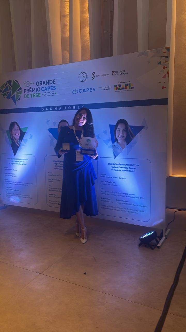 Sobre a vivência, percurso, dores e a coroação, seu esposo, Eriton Gomes Carneiro, também registrou o momento histórico. “Uma noite épica e memorável, que coroou todo o esforço, suor e lágrimas que você derramou nos últimos anos com os dois maiores prêmios do ecossistema acadêmico nacional, que indica excelência sistêmica, impacto e relevância, método e maturidade científica! Eu sempre disse que você é gigante, mas agora esses prêmios carimbam com peso sua envergadura!”.